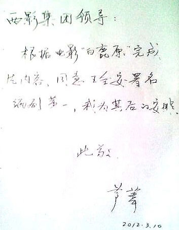 王乐:在影片完成以后,芦苇通过西影提出署名第一的要求,我们觉得不大合适,因为电影《白鹿原》没有使用芦苇的剧本,但考虑对他的尊重,同意他作为编剧第二的署名。后来芦苇提出观看影片的要求。芦苇观看影片以后,承认影片没有使用他剧本的事实,并同意他在编剧署名第二的安排。我们要求他做出了书面的说明。